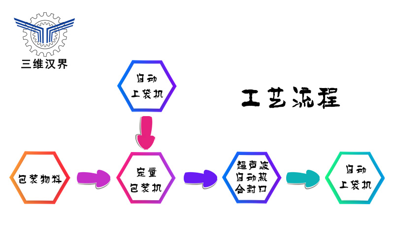 生產(chǎn)出的物料首先進入緩存料倉中,待包裝機開始包裝時,當重量達到事先設(shè)定好的值時,包裝機停止給料。自動上袋機自動拾取包裝袋,通過上袋機將包裝袋套在包裝機下料口處,包裝機檢測到包裝袋,螺旋開始工作將物料送入包裝袋內(nèi),等到填袋完畢后,夾袋裝置松袋推袋裝置將裝滿物料的袋子推到輸送機上超聲波封口,最后再由輸送機將包裝好的物料包裝袋輸送到下個工序。